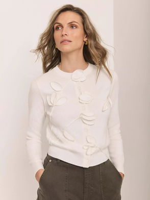 Floral Applique Popper Cardigan, White Ivory