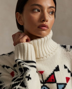 Mohair And Wool Blend Fair Isle Style Knit Sweater With Brown Jacquard Zig Zack Pattern In White