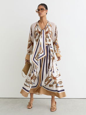 Foulard-Print Tie-Neck Midi Dress In Ivory/Neutral