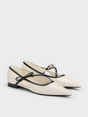 Patent Contrast-Trim Pointed-Toe Bow-Strap Flats