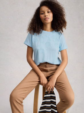 Cotton Short Sleeve Embroidered Floral T-Shirt, Blue