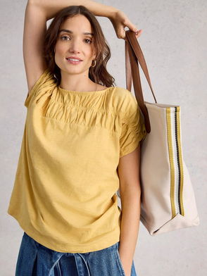 Pure Cotton Boat Neck Ruched T-Shirt, Light Yellow