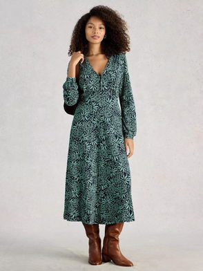 Leah Cotton Blend Long Sleeve V Neck Midi Dress
