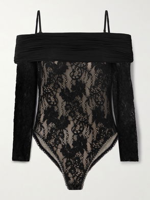 Off-the-shoulder Ruched Jersey And Stretch-lace Bodysuit