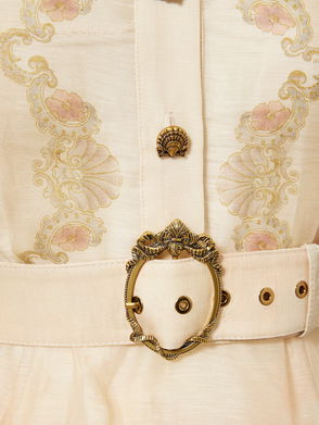 Printed Silk-Belt Buttoned Linen Mini Dress