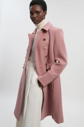 Brushed Wool Pu Trim Belted Tailored Double Breasted Midi Coat