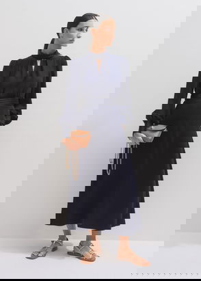Mixed Media Open Collar Maxi Dress Navy