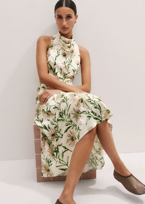 Silk Growing Daisy Print Halterneck Maxi Dress Light Cream/Green/Multi