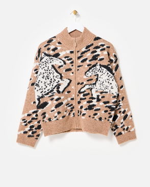 Brown Horse Print Zip Up Knitted Bomber Jacket