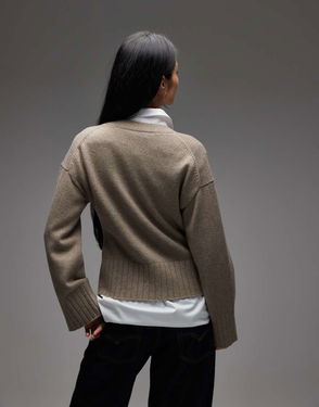 Pure Wool Lettuce Edge Long Sleeve Top With Thumbhole Detail In Brown
